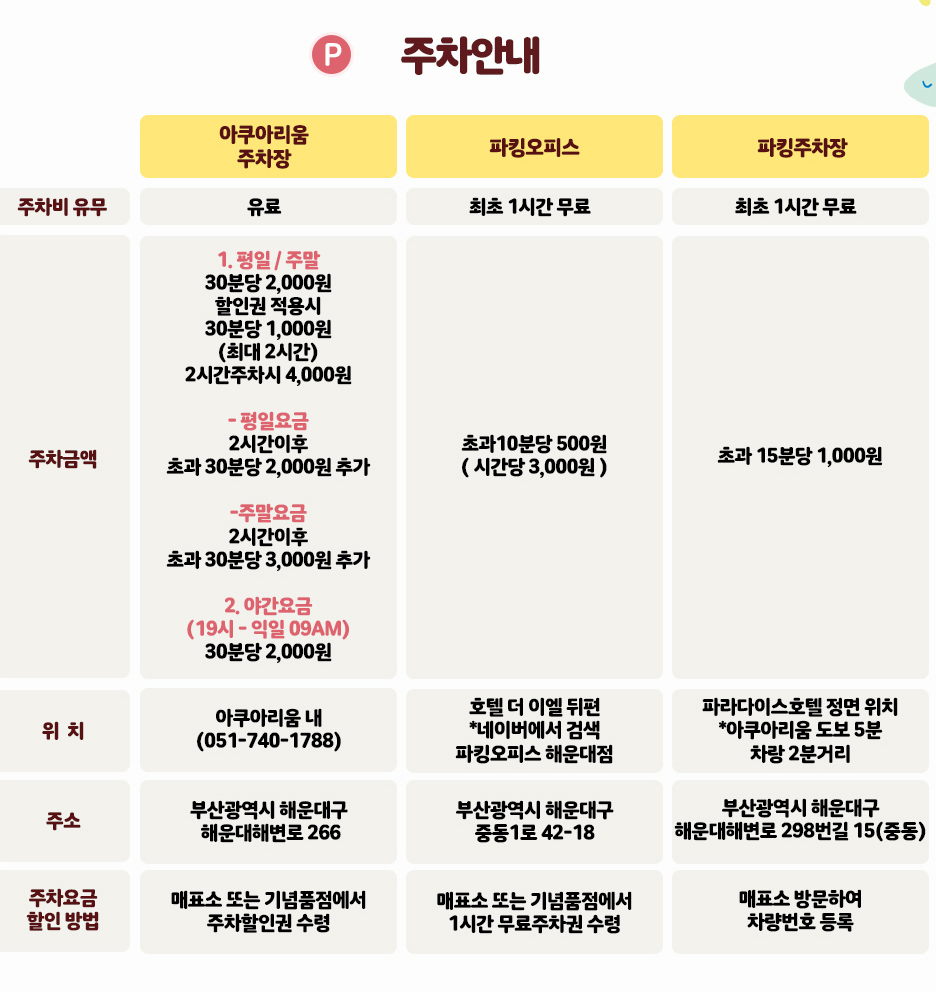 지하철 이용 시2호선 해운대역 하차 후 해운대 해수욕장 방향으로 도보로 10분 소요자차 이용 시부산광역시 해운대구 해운대해변로 266 (중동)