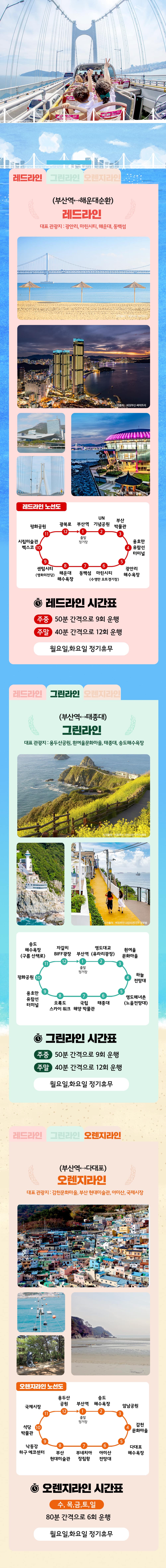 레드, 그린라인 (2시간 10분), 오렌지라인 (2시간 20분), 블루라인 (운행중단중)