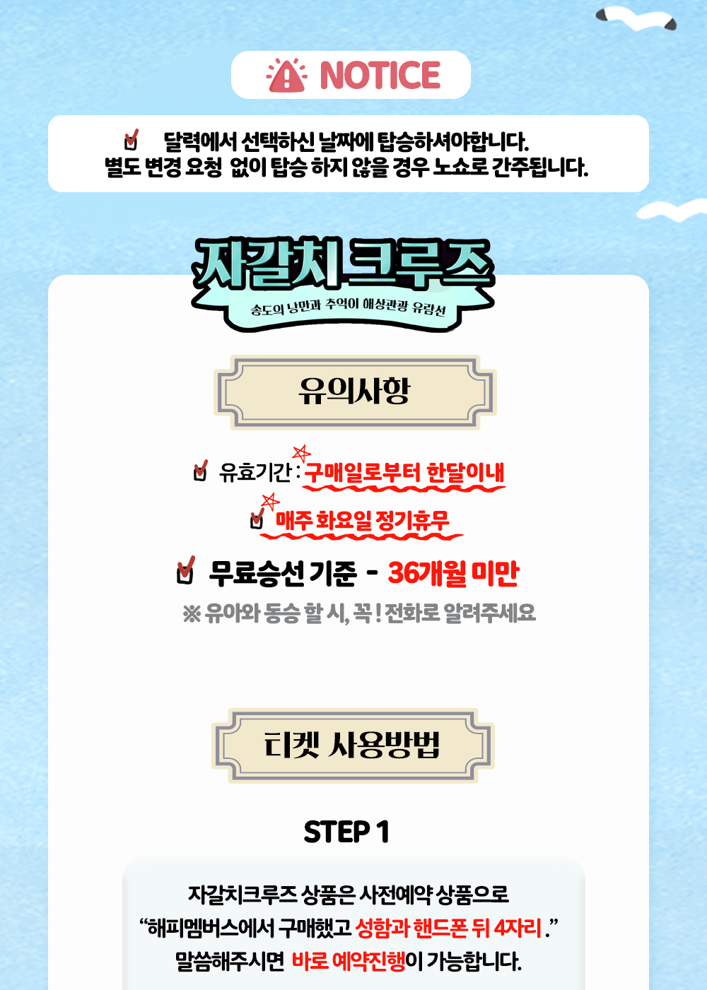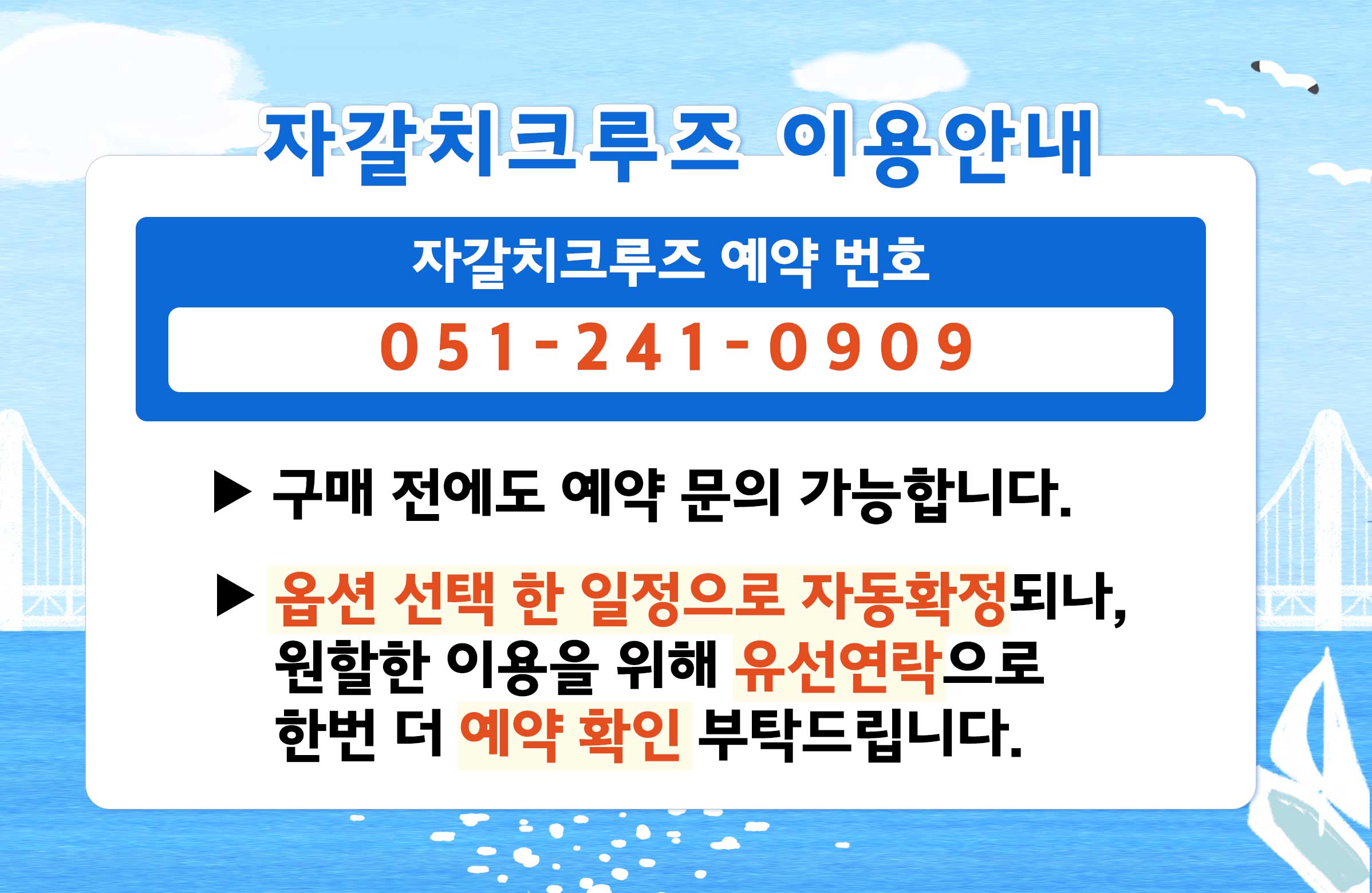 · 고객님 사정으로 환불을 원할 경우 반드시 자갈치크루즈에 먼저 연락하셔야 합니다